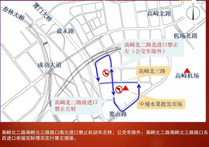鳌园路(龙船路口至石鼓路口)—石鼓路(鳌园路口至嘉庚路口)实施机动车由南往北单向通行,禁止机动车由北往南行驶;