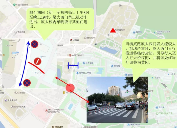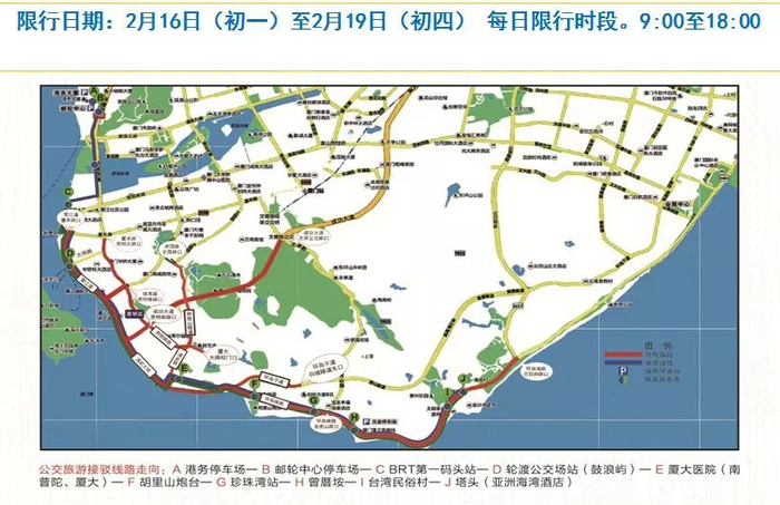 为有效缓解2018年春节旅游黄金周厦门各个景区周边道路交通的拥堵问题,厦门交管局决定在各景点周边部分道路采取道路交通限制措施。
