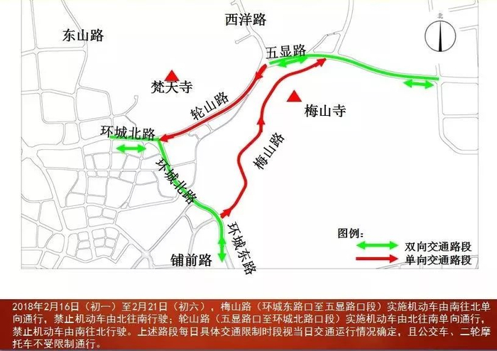 [路段、措施]梅山路(环城东路口至五显路口段)实施机动车由南往北单向通行,禁止机动车由北往南行驶;