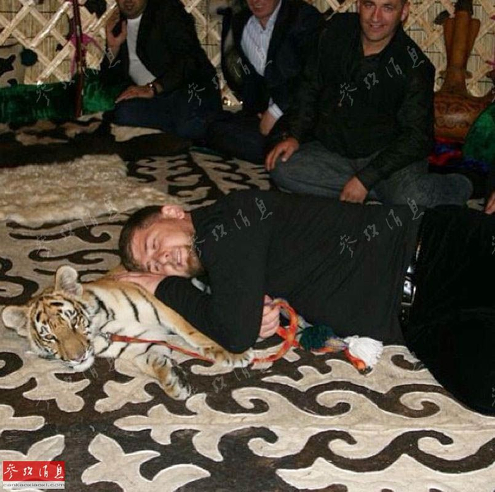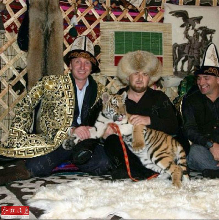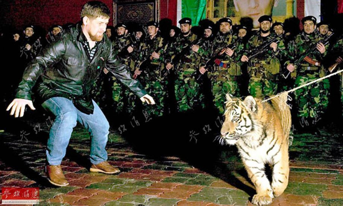 图为卡德罗夫怀抱一只老虎,看似勇猛,但实际上是这只老虎打小就被他饲养,早被圈养成一只大猫了。