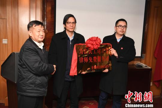 1月4日,2018年度“为农民工讨薪工资律师免费服务团”专项法律服务活动启动仪式上,湖南省人大常委会副主任谢勇(图左一)为秦希燕联合律师事务所授牌。(资料图) 杨华峰 摄