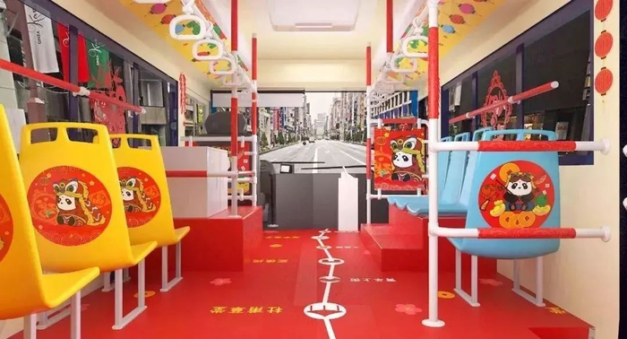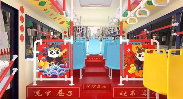 “年味观光巴士”车厢内,地板和栏杆都被装饰成大红色,每个座椅背后,贴着熊猫元素的年画;墙上、扶手旁,则点缀了灯笼的贴纸。“你们都去景点人挤人吧,留我自己在公交车上过年。”有网友打趣道。