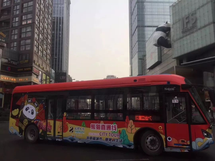 与平时的公交车不同,这辆观光巴士“花俏”许多——大红当底色,上面还画有年画。年画的主角,正是“自带流量”的川籍明星大熊猫,它们有的戴着龙头、有的穿着川剧戏服。