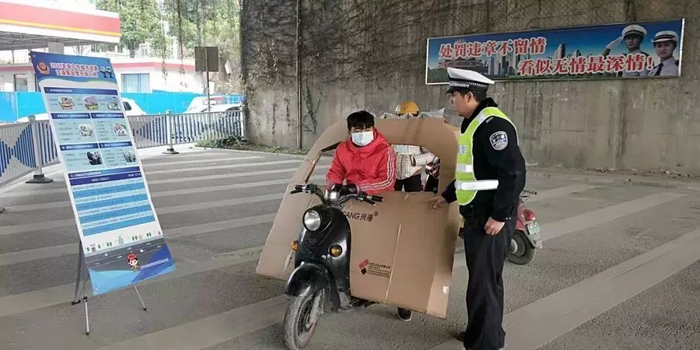 2月6日上午,民警在邕武立交桥底执勤时发现,一辆电动自行车驾驶员居然是钻进一个纸盒箱中进行驾驶操作的。民警见状立即上前将其拦下,经询问,该车驾驶员在踏板上放了一件明显超高超宽的物件,由于物件过大遮挡了驾驶操作,车主就突发奇想,将盒子剪开,并把身体从开口处伸出来驾驶。