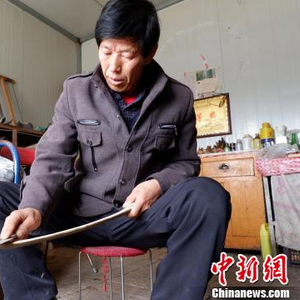 图为马国财打磨弓胎。 李隽 摄