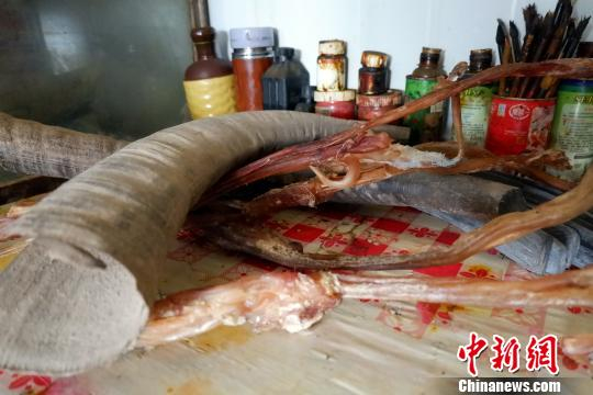 图为制作牛角弓所需的牛角和牛筋. 樊永涛 摄
