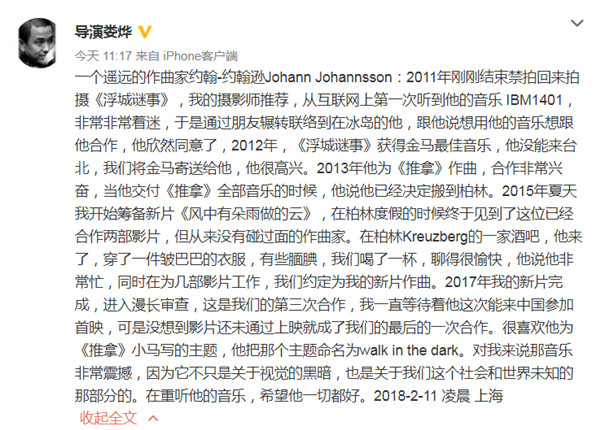 娄烨导演也罕见地在微博写下长文以示纪念:“一个遥远的作曲家约翰-约翰逊Johann Johannsson:2011年刚刚结束禁拍回来拍摄《浮城谜事》,我的摄影师推荐,从互联网上第一次听到他的音乐《IBM1401》,非常非常着迷,于是通过朋友辗转联络到在冰岛的他,跟他说想用他的音乐想跟他合作,他欣然同意了,2012年,《浮城谜事》获得金马最佳音乐,他没能来台北,我们将金马寄送给他,他很高兴。2013年他为《推拿》作曲,合作非常兴奋,当他交付《推拿》全部音乐的时候,他说他已经决定搬到柏林。2015年夏天我开始筹备新片《风中有朵雨做的云》,在柏林度假的时候终于见到了这位已经合作两部影片,但从来没有碰过面的作曲家。在柏林Kreuzberg的一家酒吧,他来了,穿了一件皱巴巴的衣服,有些腼腆,我们喝了一杯,聊得很愉快,他说他非常忙,同时在为几部影片工作,我们约定为我的新片作曲。2017年我的新片完成,进入漫长审查,这是我们的第三次合作,我一直等待着他这次能来中国参加首映,可是没想到影片还未通过上映就成了我们的最后的一次合作。很喜欢他为《推拿》小马写的主题,他把那个主题命名为walk in the dark。对我来说那音乐非常震撼,因为它不只是关于视觉的黑暗,也是关于我们这个社会和世界未知的那部分的。重听他的音乐,希望他一切都好。”