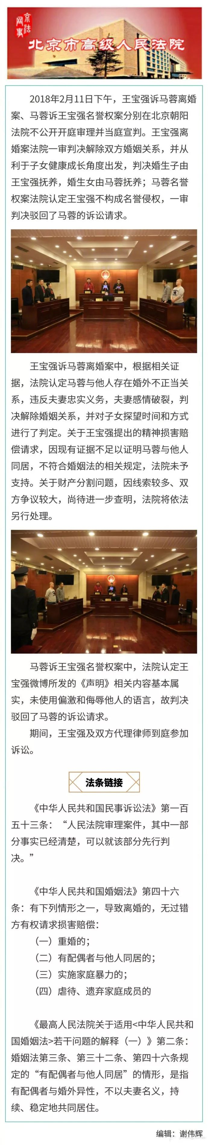 2月11日下午,王宝强诉马蓉离婚案、马蓉诉王宝强名誉权案分别在北京朝阳法院不公开开庭审理并当庭宣判。王宝强离婚案法院一审判决解除双方婚姻关系,并从利于子女健康成长角度出发,判决婚生子由王宝强抚养,婚生女由马蓉抚养;马蓉名誉权案法院认定王宝强不构成名誉侵权,一审判决驳回了马蓉的诉讼请求。