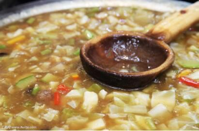 西安人的早点,肉丸胡辣汤也叫八珍汤,汤里有浑圆的牛肉丸子,切成块状的土豆,莲花白,胡箩卜等。吃的时候淋上油泼辣子及香油,及手掰的坨坨馍;吃罢舌尖发麻,微微冒汗,浑身舒坦。