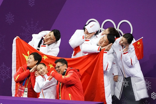 2月11日,韩国,2018平昌冬奥会次日花样滑冰团体赛女子单人滑短节目,李香凝出战。赛后全队合影。视觉中国供图