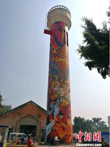 2月11日,广西南宁市江南区绢纺厂旧址内,一座高达33米的老旧水塔换上了色彩鲜艳涂鸦喷绘“新衣”,引人注目。