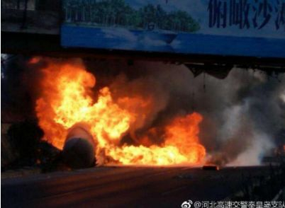 2月11日上午8时30分许,京哈高速北京方向292公里山海关收费站附近,一辆运输液化气的罐车发生侧翻,致使液化气泄漏,路面瞬间起火,邻近三辆小轿车被大火吞没。