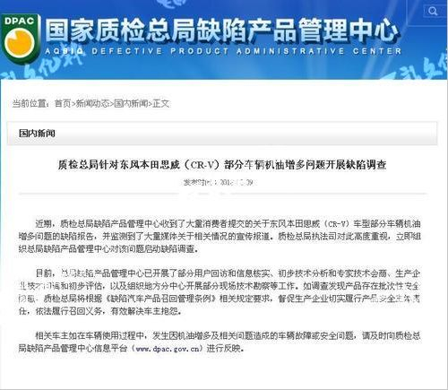 吉林市不少2017款东风本田CRV越野车的车主反映的,该款车机油异常增多的问题,近日有了新进展,11日,国家质检总局缺陷产品管理中心官方网站发布信息称,质检总局已经开展缺陷调查。