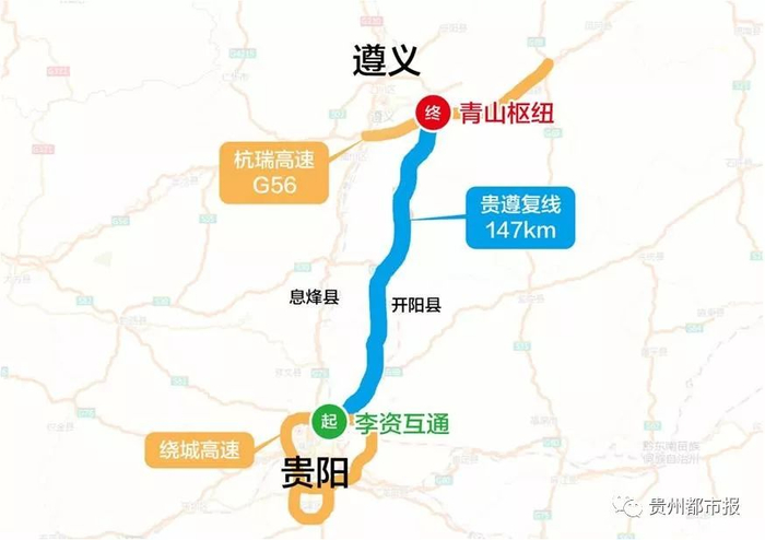 贵遵复线全长约154公里,双向6车道,通行时速100公里/小时,相比走老贵遵路至少节省40分钟。全线服务区、加油点尚在建设中,请提前加油。开阳境内雾大路面湿滑,请谨慎驾驶。