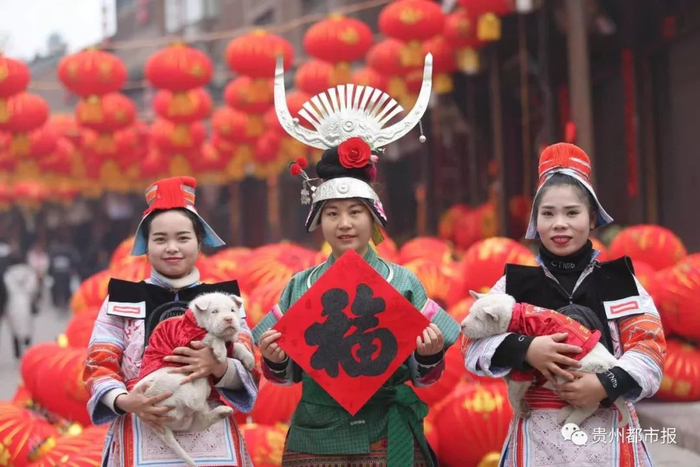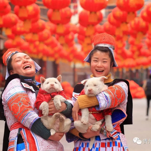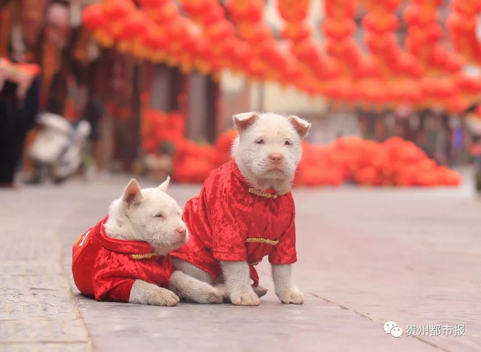 2月11日,下司古镇的苗族同胞给下司幼犬穿上喜庆的大红春节服,犹如萌娃一般的打扮让人们在狗年即将到来时感受到了一波“旺气”。