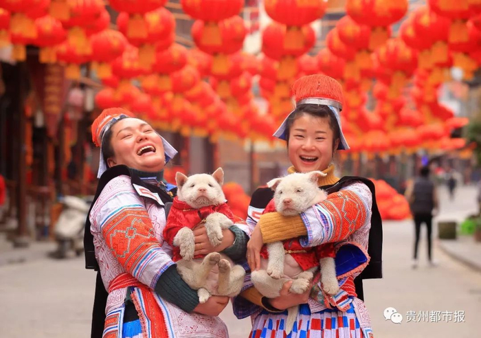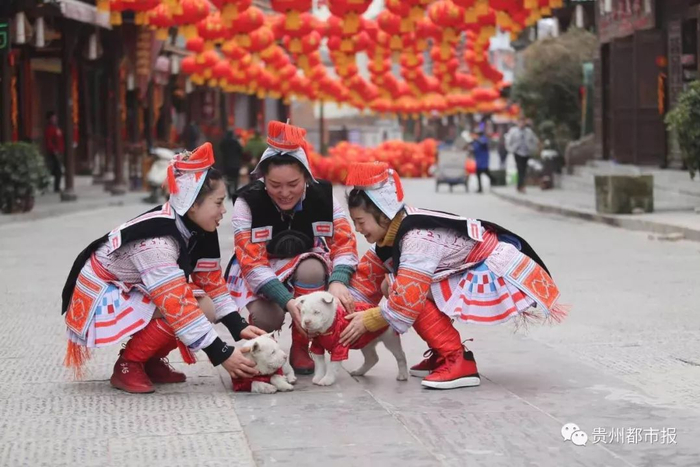 当天凯里下司古镇景区的街道上,几位身着盛装的少数民族少女将代表着节日喜庆的大红唐装迷你版穿在了两条下司幼犬身上,显得特别可爱。