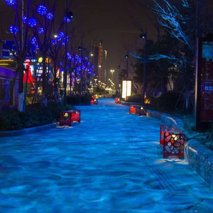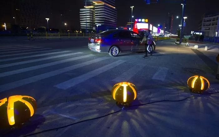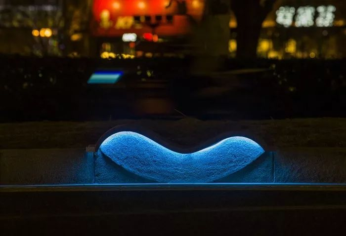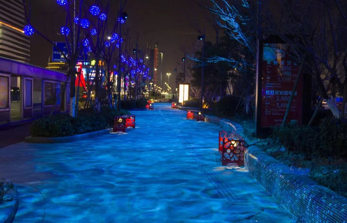 宁穿路海晏路地铁口:可感受互动栏杆灯、特色车挡石和后退空间内水波涟漪的水舞灯;