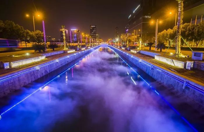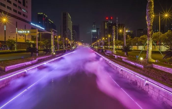 由于灯光采用“见光不见灯”的设计理念,白天灯具与城市基础设施融为一体,比如波浪侧石灯,南瓜车挡石、精美的休闲座凳、感应栏杆、悄无声息的雾森,夜间就成了另外一番景致,特别是宁东路的雾森景观效果,源源不断的彩色水雾把原来不起眼的河道打造得如梦似幻、宛若仙境。
