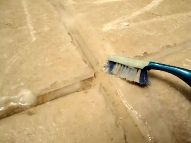 再用牙刷轻轻刷洗,瓷砖缝里的脏东西,立刻就消失啦。