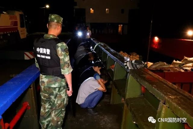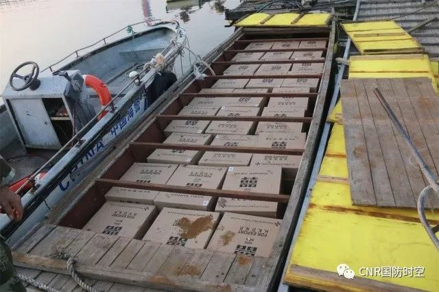 广西海警官兵在辖区竹山围墙海堤附近海域查获涉嫌运输无合法手续香烟的船舶1艘及香烟一批。