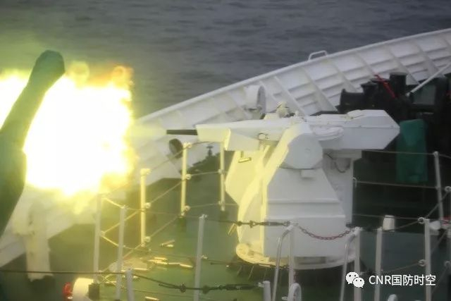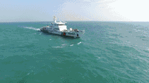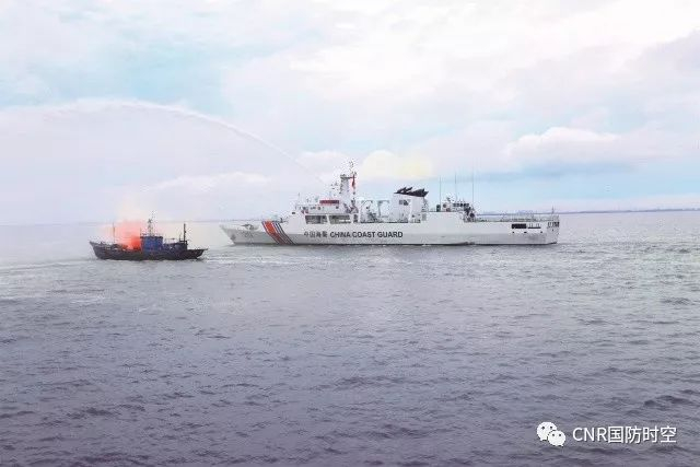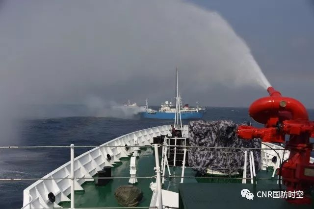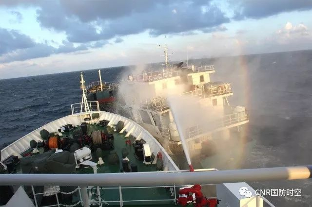 浙江海警舰船在辖区海域追击非法走私成品油船,使用水炮压制涉案船舶。