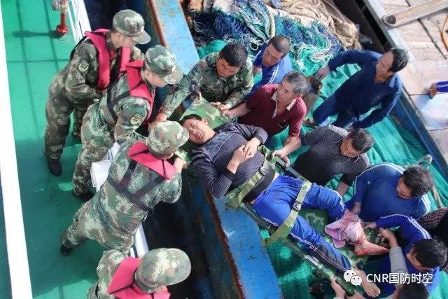 浙普渔41XXX船一名船员在收网作业时不慎将左脚卷入收网机,浙江海警紧急赶往现场成功施救。