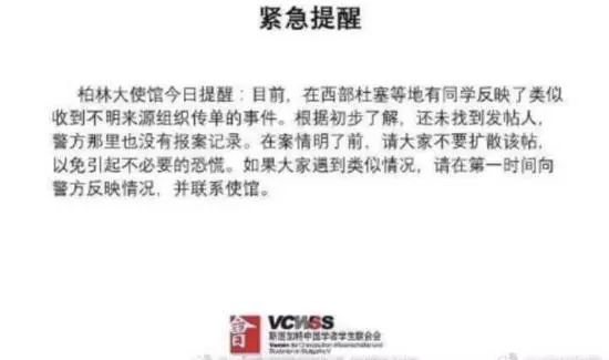 此前德国柏林大使馆方面也发出声明称:“在西部杜塞等地有同学反映了收到不明来源传单事。根据初步了解,还未找到发帖人,警方也没有报案记录。”