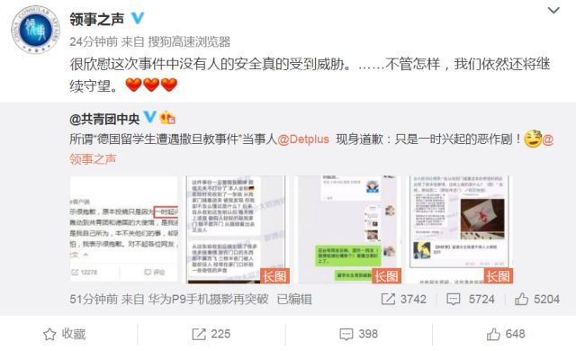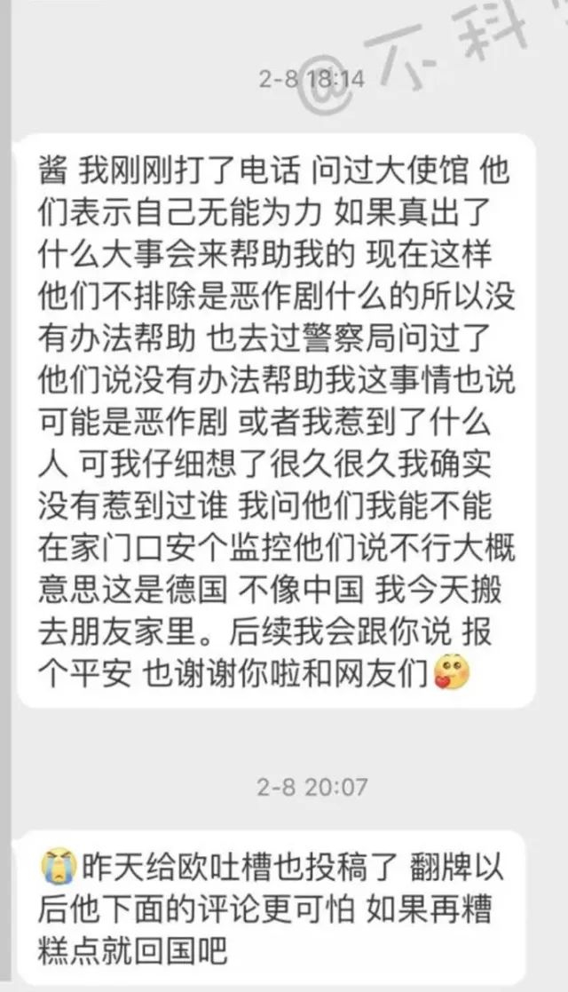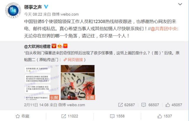 鉴于此事在网络上掀起了一阵巨大的恐慌,@共青团中央和外交部领事保护中心@领事之声也表示高度重视,他们纷纷转发了该留学生的求助贴。@领事之声更是建议该学生立刻报警,并私信他们寻求帮助,并发博称:“中国驻德5个使领馆领保工作人员和12308热线彻夜跟进,也感谢热心网友的来电、邮件或私信。真心希望当事人或其他知情人尽快联系我们!”