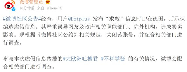 不久,@微博管理员发布微博社区公告称:经查,用户@Detplus 发布“求救”信息时IP在德国,后承认编造虚假信息。其严重误导网友及政府相关职能部门、驻外机构,造成恶劣影响。现根据《微博社区公约》相关规定,关闭该账号,并配合相关部门进行调查。