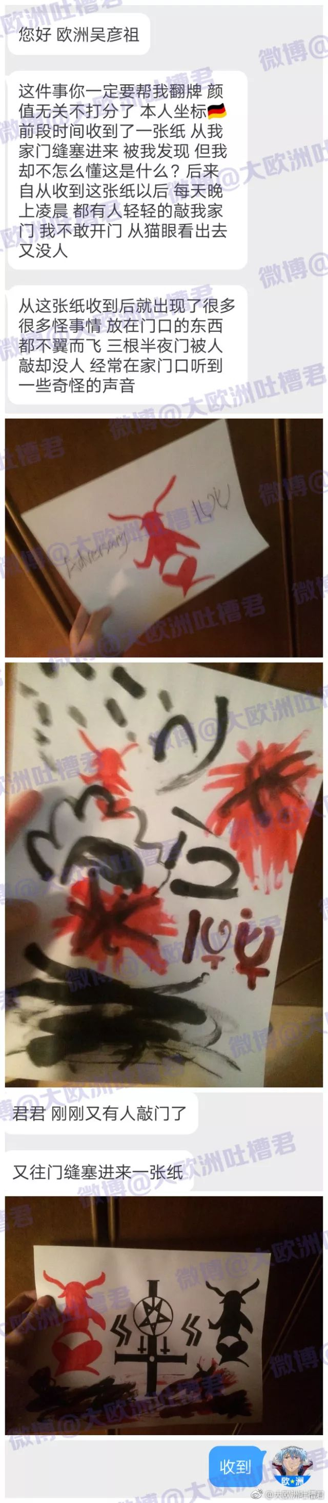 近日,一名在德国的中国留学生在网上曝出其所在公寓接连从门缝收到画有奇怪的图样的卡纸,并声称已经从杜塞搬到法兰克福,可此“灵异事件”并未停止。