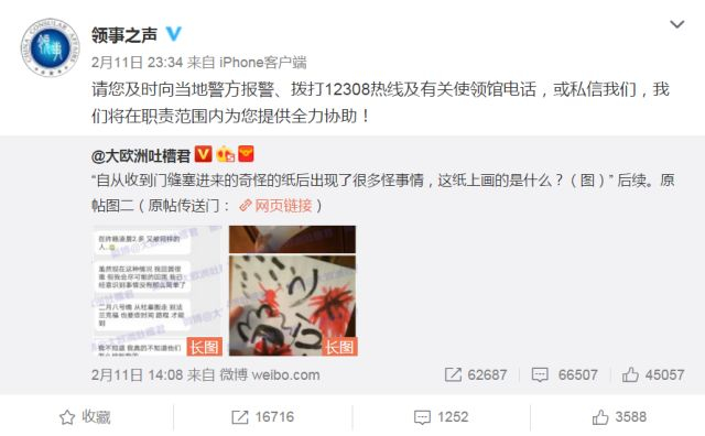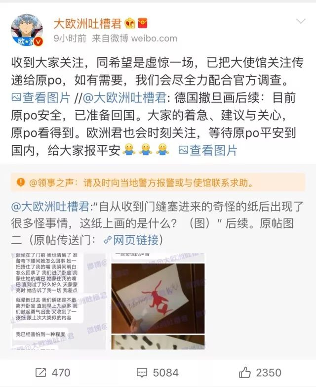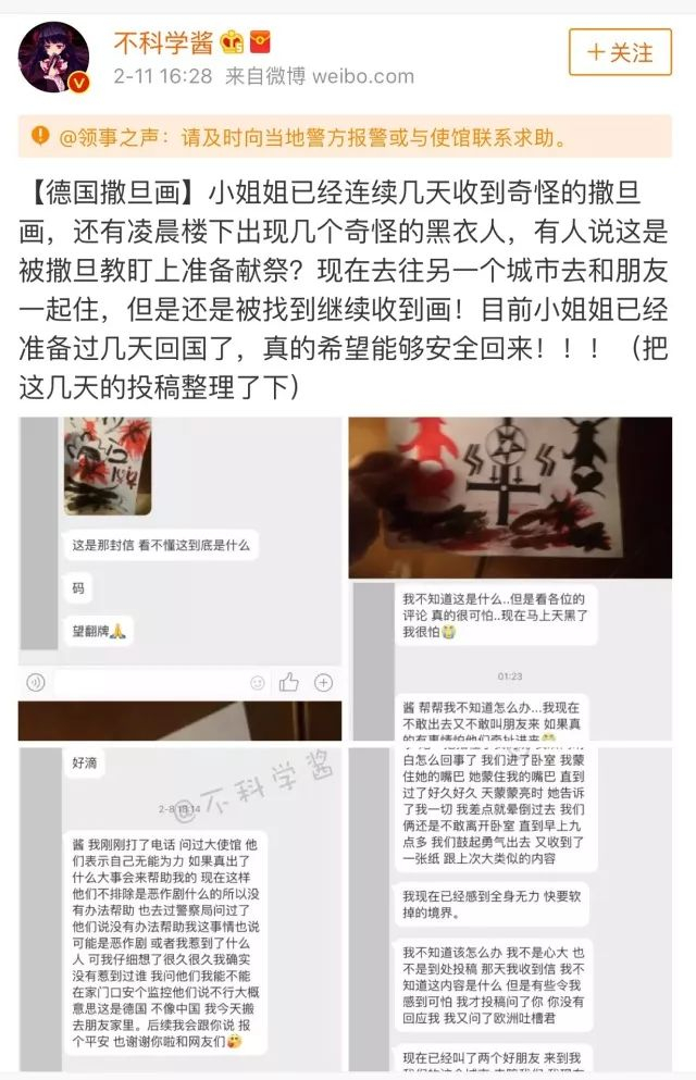 近日,网上流传消息称,一名身在德国的中国留学生收到被称为“撒旦画”的传单,暗示人身安全受到威胁。这一消息经微博账号 @不科学酱 和 @大欧洲吐槽君 发布后迅速引发网民关注,此事甚至惊动了外交部领事保护中心@领事之声,建议其赶快报警,尽快向当地大使馆求助。