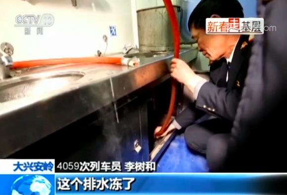 在极寒环境下,洗脸间和厕所的下水管经常被厚厚的冰雪冻住,乘务组每隔一段时间就得用开水给洗漱间和厕所的下水管解冻。