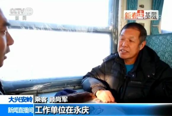 乘客 顾尚军:我家在塔河,工作单位在永庆,每天都往返这趟车。有的时候就我一个人上车,能停一下车,可以说是铁路部门对我们的照顾。我坐这个车都20多年了,那时候是30多岁,现在都54岁了。现在我儿子也在坐,我们在山里面,它是我们最好的交通工具。