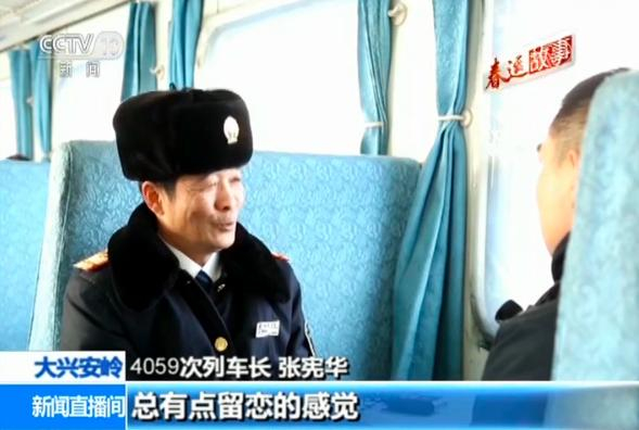 4059次列车长 张宪华:总有点留恋的感觉,这个工作说心里话还真挺愿意干的。有一种感情,每天上车打打招呼在一起说说笑笑的,有什么事互相有的都留电话号,这种感情还是挺好的,旅客也挺依赖我们的。再一个,班组成员在一起,我们班组成员在一起就已经结下非常深厚的感情。我今年4月末退休了就,最后一个春运,上好最后一班岗。