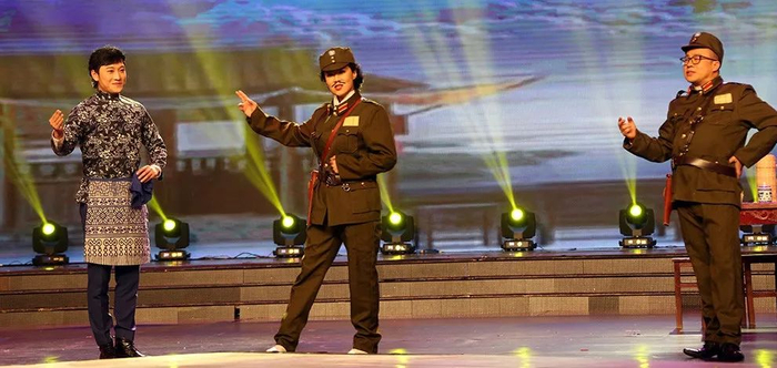 晚会每个节目、每个互动环节都做了精心设计,龙广电的主持人也都拿出了各自的看家绝活。这不,由龙广电主持大咖张进、梁枫、大鹏共同演绎的经典京剧《沙家浜•智斗》就把晚会推向了高潮。为了增添反差效果,大家所熟知的阿庆嫂角色由大鹏饰演,张进扮演刁德一,梁枫扮演胡传魁。这个反串儿表演惟妙惟肖,现场掌声雷动。台下观众看着过瘾,可对于角色的拿捏、声音的控制,三位主持人可是没少下功夫。