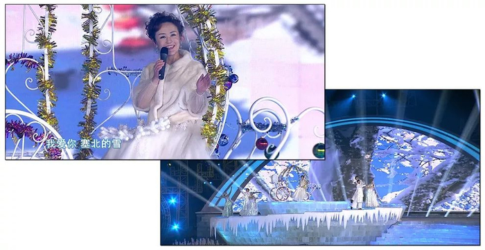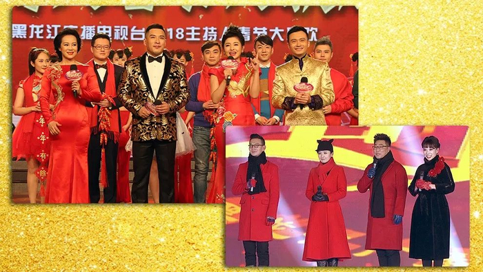今年的《龙广电主持人春节大联欢》采用内外景结合,内景在2800米演播大厅,由小翟、陈聪、张进、卢汉主持,现场高朋满座,春意盎然;外景录制是在哈尔滨华南城冰河世界欢乐谷,由姚莉、胡刚、姜多、马忱主持,冰雪舞台,美轮美奂。