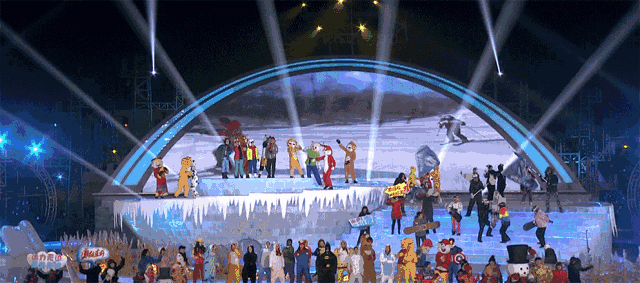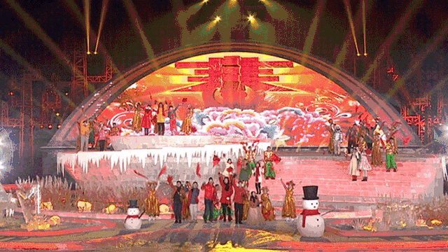 外景开场歌舞《名嘴欢歌贺新春》,龙广电主持大咖在冰雪舞台欢歌大拜年。内景开场歌舞《年都笑了》在2800米演播大厅带现场观众嗨起来!