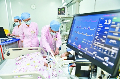福建省妇幼保健院重症医学科主任王世彪(右)在为患儿听诊。照片为新华社发
