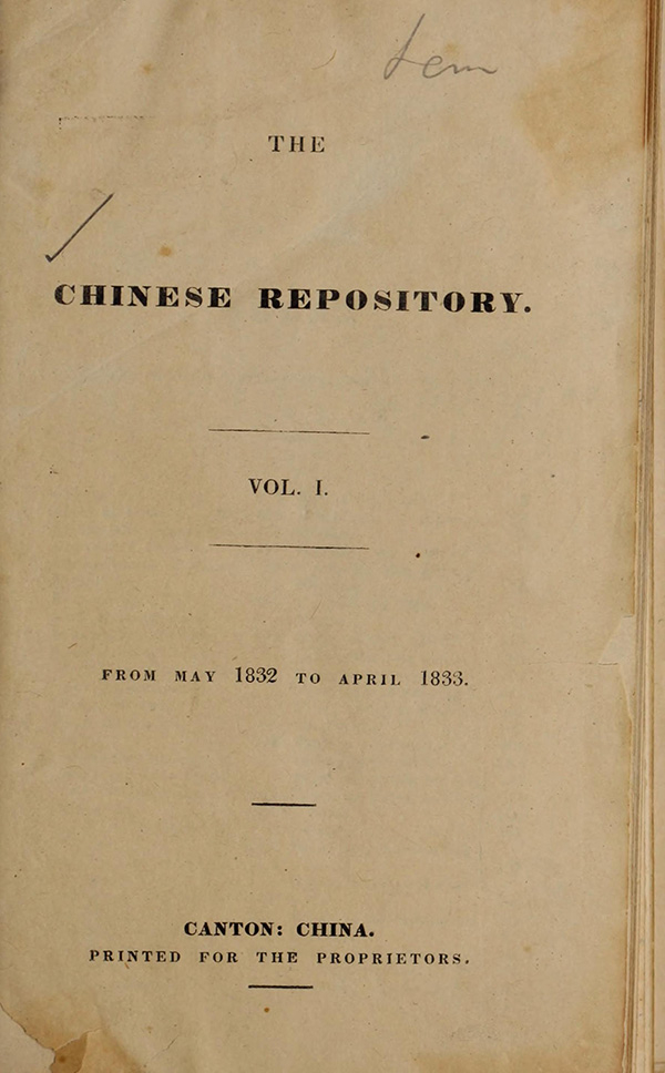 1834年8月号的英文报纸《中国丛报》中将“夷目”(外国人头目)译成“barbarian eye”(野蛮人的眼睛),这一译文激怒了英国官员。1834年9月8日,感到自己被蔑称的英国驻华商务总监律劳卑对清政府宣战。图为1832年创办于广州的《中国丛报》第一卷。