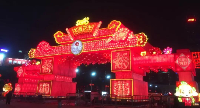 天河花市以“金犬贺岁,百福临门”为主题,牌楼主体外观为“天”字大门,配以如意造型,“福”字装饰,左右金犬携宝贺岁,整座牌楼既传统喜庆又大气时尚。