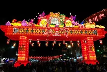 海珠花市以“美丽广州 幸福海珠”为主题,以海上丝绸之路重要港口——黄埔古港牌坊为原型,红灯高悬、金狗闹春,营造出春节独有的民俗风情。