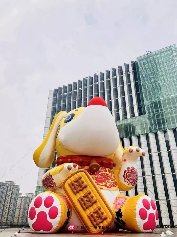 从广州塔望去,珠江对岸旁新竖立起一只大型“吉祥狗”,有望成为今年广州花市的新“网红”。它身高28米,打破2017年世界上最大的充气大黄鸭保持的26米高度纪录。这只憨态可掬的中华田园犬手持刻有“旺旺旺”的大金币,代表了市民对狗年的美好期望。