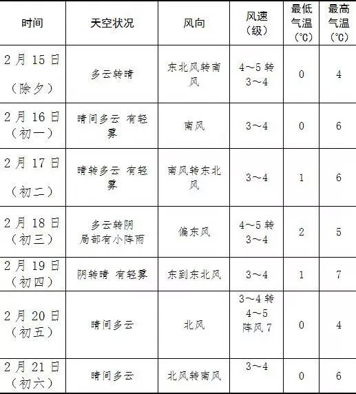 1除夕,多云转晴,东北风4~5级转南风3~4级,海上6~7级阵风8级,最高气温全市4~5℃,最低气温市区和沿海地区0℃左右,内陆地区-5~-1℃;2初一到初二,晴转多云,有轻雾,南风转东北风3~4级,最高气温全市6~9℃,最低气温市区和沿海地区1℃左右,内陆地区-5~-1℃;3初三,多云转阴,部分地区有小阵雨,偏东风4~5级转3~4级,最高气温全市6~8℃,最低气温市区和沿海地区2℃左右,内陆地区-1~0℃;4初四之后,转为多云间晴天气,5初五受冷空气影响,北风陆地4~5级阵风7级,海上6~7级阵风8级,最高气温全市4~10℃,最低气温市区和沿海地区0℃左右,内陆地区-5~-1℃。