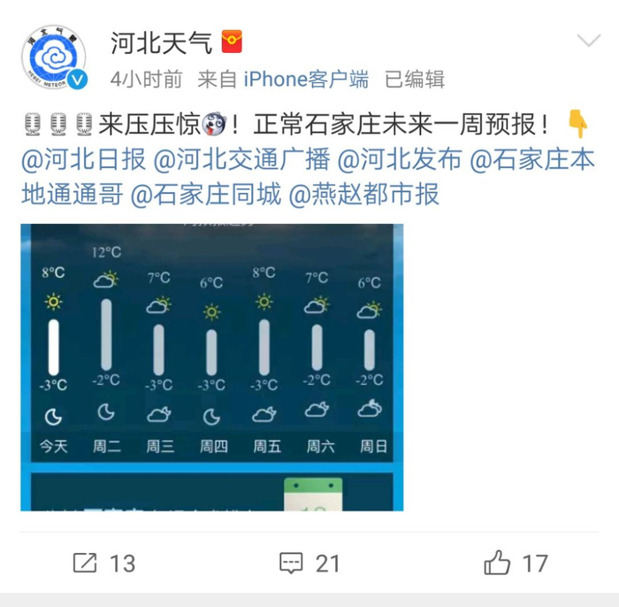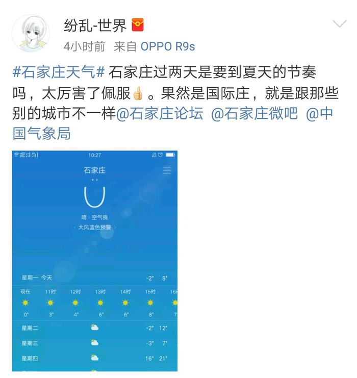 再比如,下面这是网友晒出的石家庄的天气预报,也是过年秒入夏?