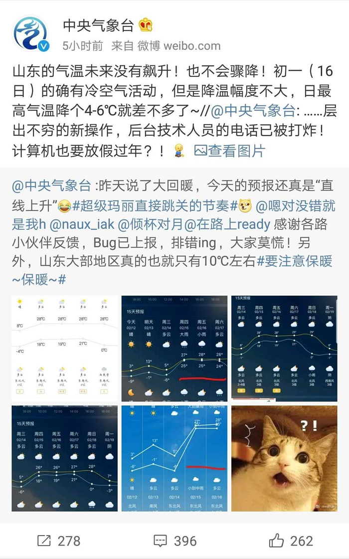 经过网友提醒,中央气象台也发现这一异常,通过微博多次回应:天气预报有BUG!