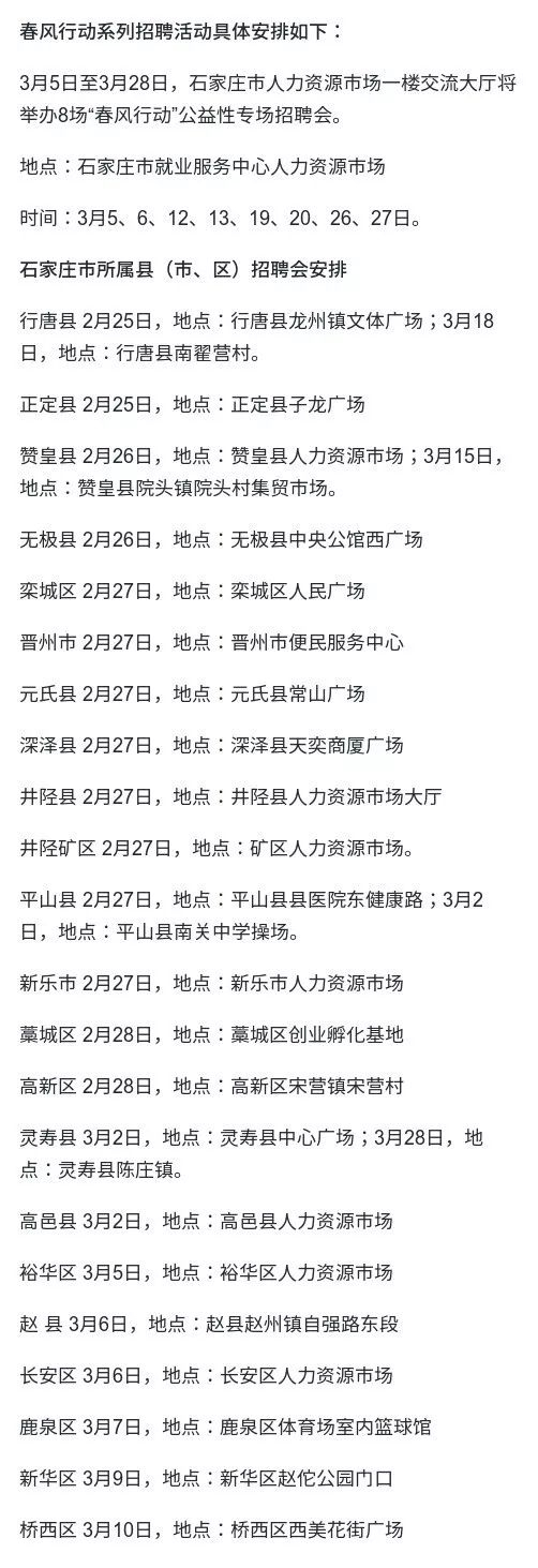 2月25日至3月28日,石家庄将举办34场春风行动系列招聘会