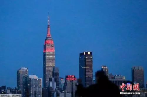 资料图:美国纽约帝国大厦点燃金色和红色灯光,庆祝中国农历新年。