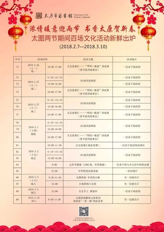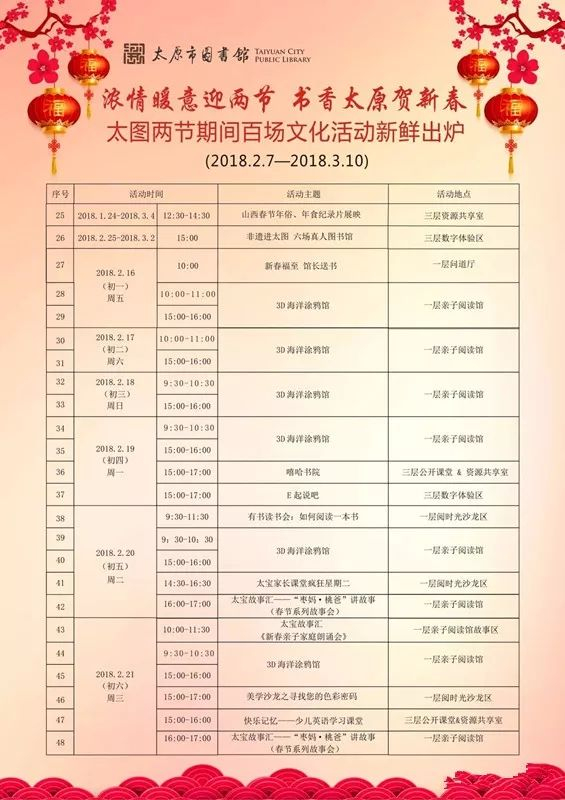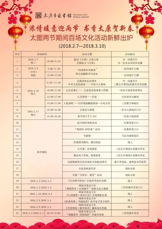 内容:开展漪韵读书汇、漪汾讲坛、猜谜元宵乐、古籍线装书制作和“活字印刷术”体验活动等读者活动。
