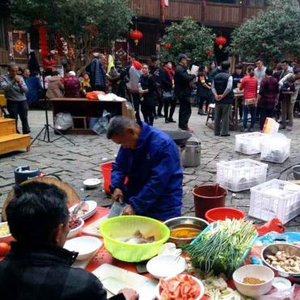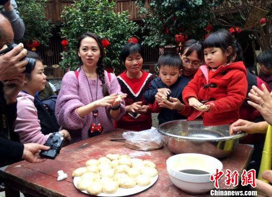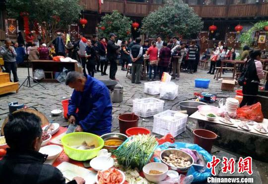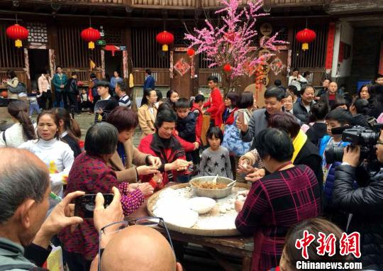 中新网永定2月14日电 (李文星)14日,大年二十九,福建省龙岩市永定区高头乡福建土楼王景区侨福楼热闹非凡,2018年“两岸客家土楼过大年”活动在此隆重举行。来自台湾、深圳、梅州、厦门等地的30余个客属家庭110多人与永定土楼客家人欢聚一堂过大年,体验传统客家过年习俗,传承客家文化。