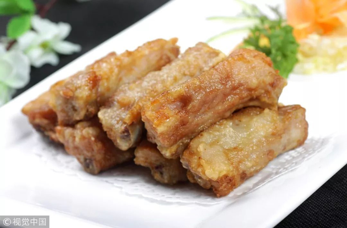 此菜色泽金红、肉质滑嫩、口味丰富、蒜香浓郁。以猪肋骨,海鲜酱,沙茶酱,老抽,生抽,蚝油,味精,白糖,干辣椒,蒜茸等制作而成。